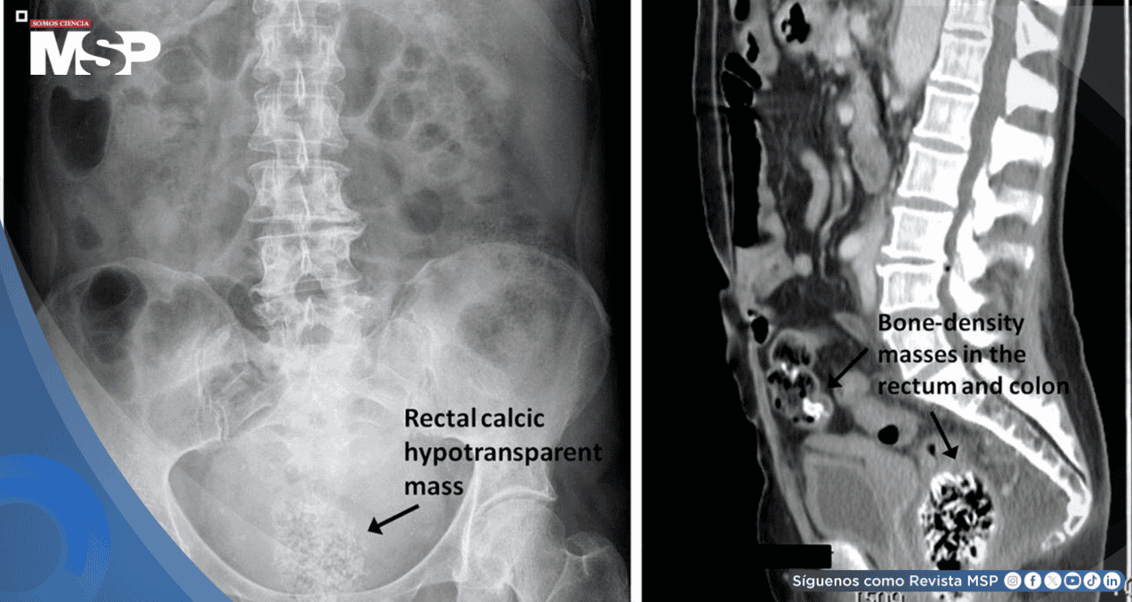 Durante los dos días previos a esta consulta, el paciente ya había visitado otro servicio de urgencias en dos ocasiones por la misma sintomatología. En esas oportunidades se intentó la desimpactación manual, logrando extraer únicamente algunas semillas sueltas de una masa endurecida alojada en la bóveda rectal.