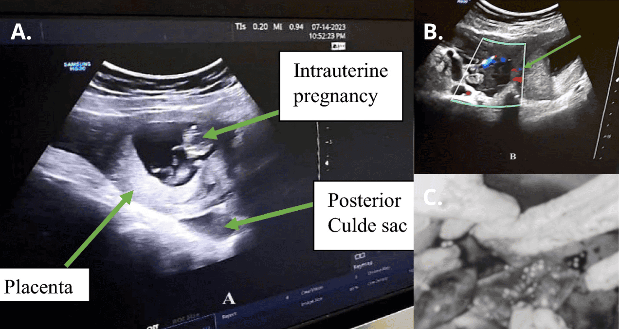 Según la literatura médica, el uso de la ecografía transabdominal aumenta la sensibilidad para el diagnóstico de un embarazo ectópico del 53 % al 73 %. Una ecografía Doppler transabdominal mostrará un aumento del flujo sanguíneo caracterizado por un patrón de fuego de alta velocidad en la masa anexial. En este caso, el diagnóstico se realizó mediante ecografía transabdominal, que mostró un aumento del flujo sanguíneo.