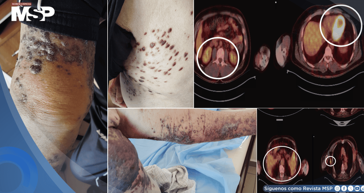 A principios de 2025, el paciente mostró una respuesta positiva temporal a la reiniciación de la quimioterapia, con regresión de varias lesiones en las imágenes de control. No obstante, para junio de 2025 su condición se deterioró notablemente, presentando lesiones extendidas por extremidades y cara, junto con edema.