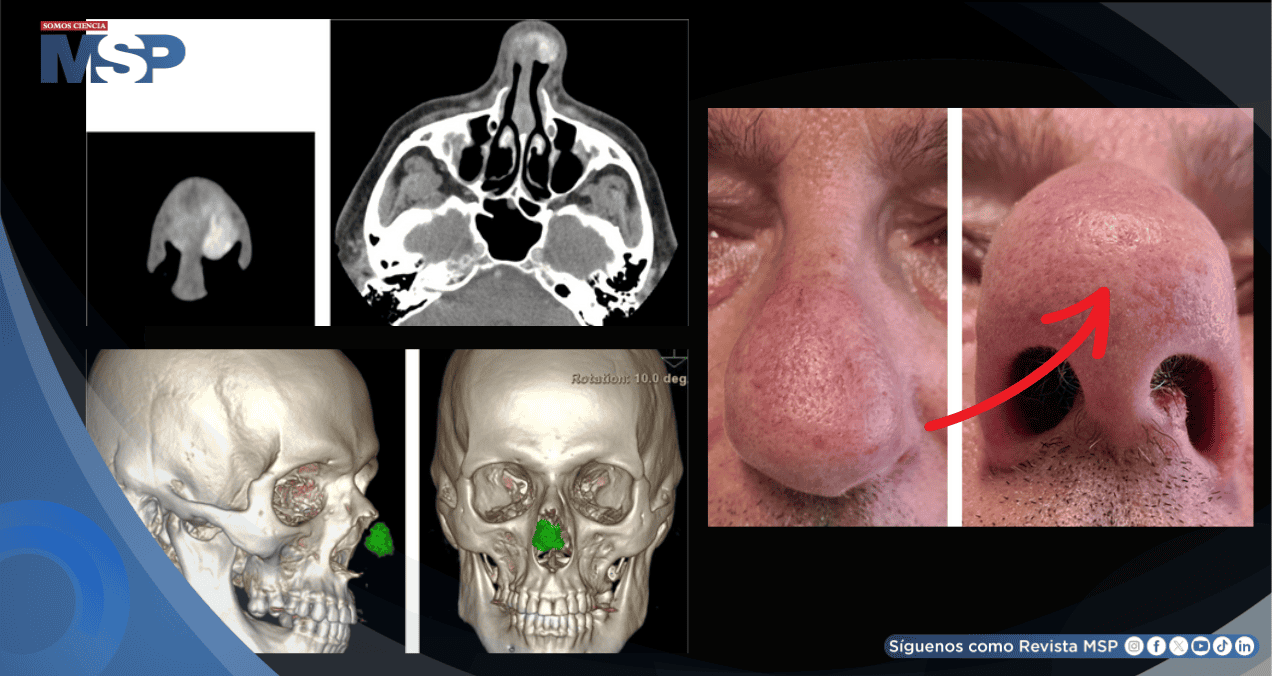 El paciente presentaba una deformidad nasal preexistente caracterizada por ensanchamiento y engrosamiento de la punta nasal, donde se palpaba una masa indolora en el vestíbulo nasal derecho.