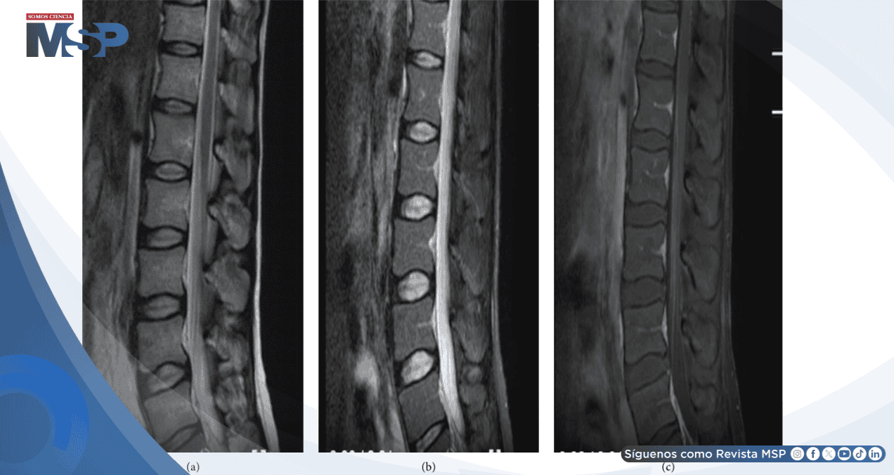 La resonancia magnética espinal fue determinante para el diagnóstico. Las imágenes demostraron hiperintensidad extensa en secuencias T2 y STIR a nivel lumbar, con realce tras la administración de gadolinio.