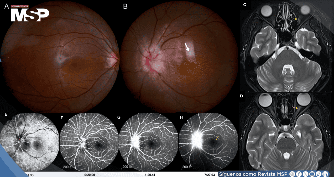 Al examen físico, la agudeza visual mejor corregida del ojo izquierdo era de 0.1, con defecto pupilar aferente relativo positivo. El fondo de ojo reveló disco óptico congestivo y edematoso con bordes difusos, además de exudados estrellados característicos en la región macular.