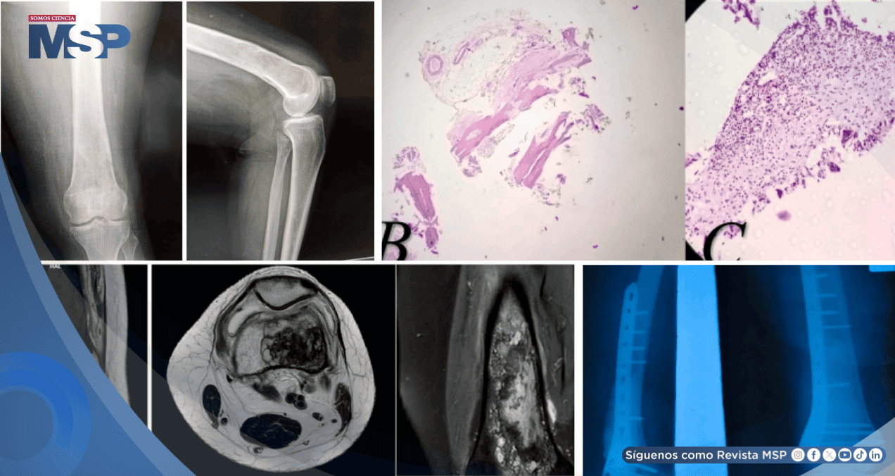 Esta discrepancia llevó al cirujano a modificar la estrategia intraoperatoriamente, optando por una resección marginal completa. El defecto óseo fue rellenado con cemento óseo (polimetilmetacrilato) y se realizó una fijación profiláctica del fémur distal con una placa anatómica.