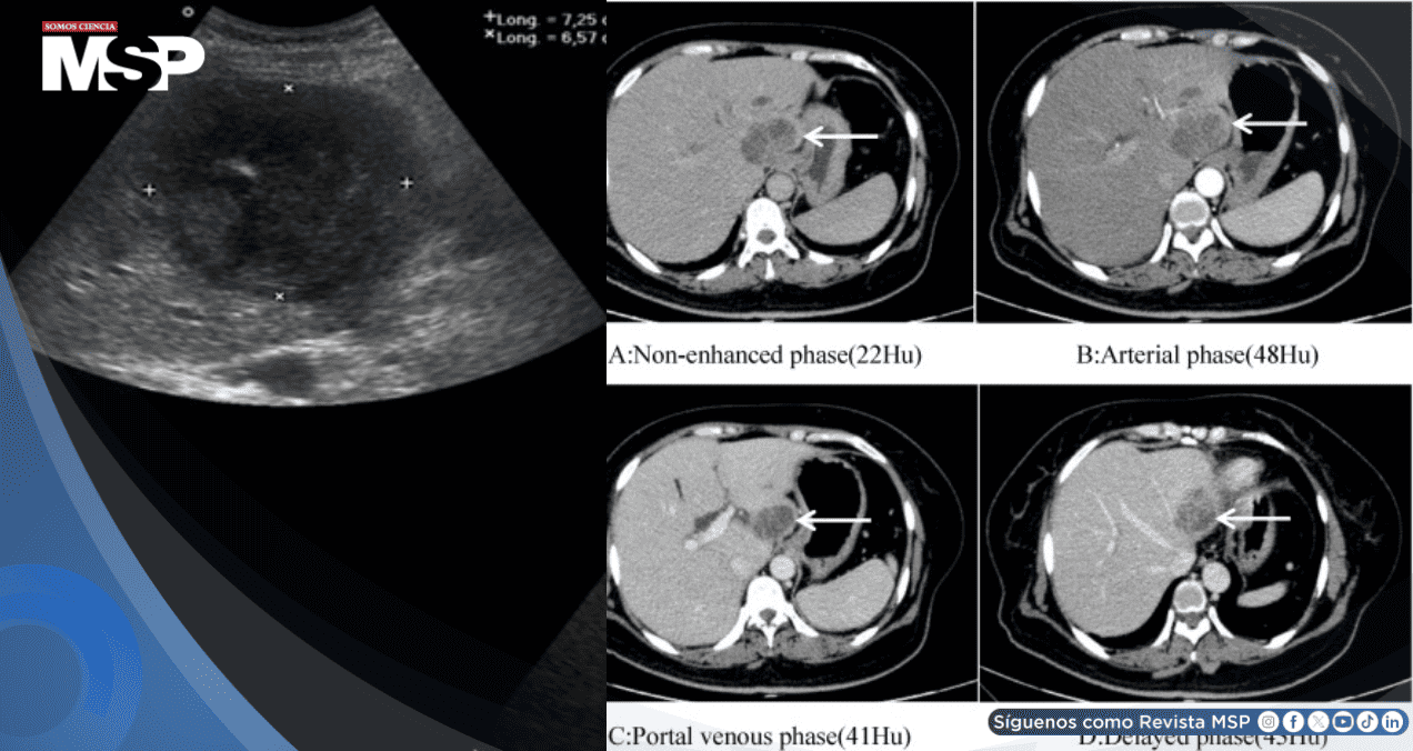 La medición de glucosa en sangre mostró un valor dramáticamente elevado de 25.7 mmol/L, mientras que una tomografía computarizada abdominal completa identificó la verdadera causa del problema: un absceso hepático de tamaño considerable (44 x 42 mm). Estos hallazgos explicaban la falta de respuesta al tratamiento inicial y orientaron el manejo hacia una condición infecciosa grave asociada a diabetes no diagnosticada.