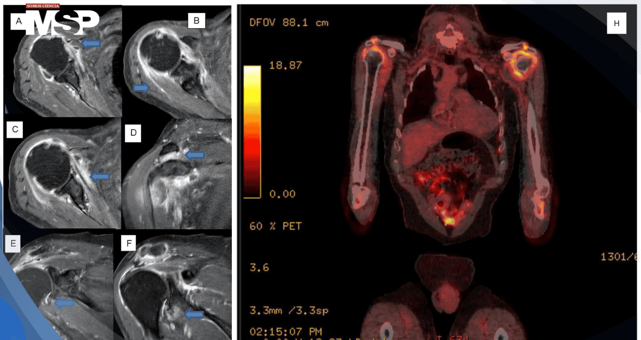 Para excluir definitivamente infección oculta, malignidad o vasculitis de grandes vasos, se realizó PET-CT con fluorodesoxiglucosa. Este estudio mostró captación aumentada de FDG en hombros y caderas de distribución simétrica periarticular, consistente con bursitis e inflamación, sin evidencia de lesiones nodales, viscerales, óseas focales, infección profunda o vasculitis de grandes vasos.