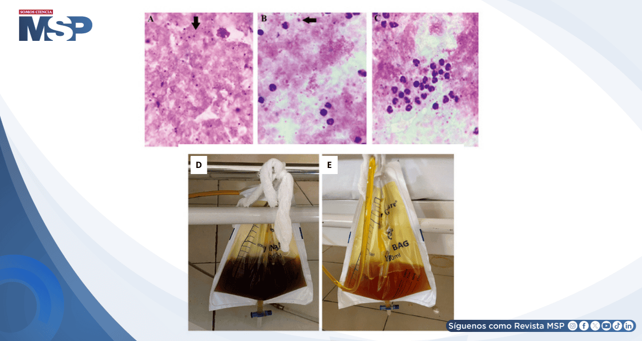 El examen físico reveló ictericia escleral intensa, hepatoesplenomegalia, hematemesis activa abundante y orina color negro característico de fiebre del agua negra. Los estudios paraclínicos demostraron falla renal aguda severa con creatinina 12.8 mg/dL, urea 529 mg/dL y BUN 246.87 mg/dL, elevación marcada de transaminasas (AST 214 U/L, ALT 409 U/L), anemia moderada (hemoglobina 9.8 g/dL), trombocitopenia (61,000/µL) e hiperbilirrubinemia notable. Las serologías para hepatitis B, C y VIH resultaron negativas, y la radiografía de tórax fue normal.