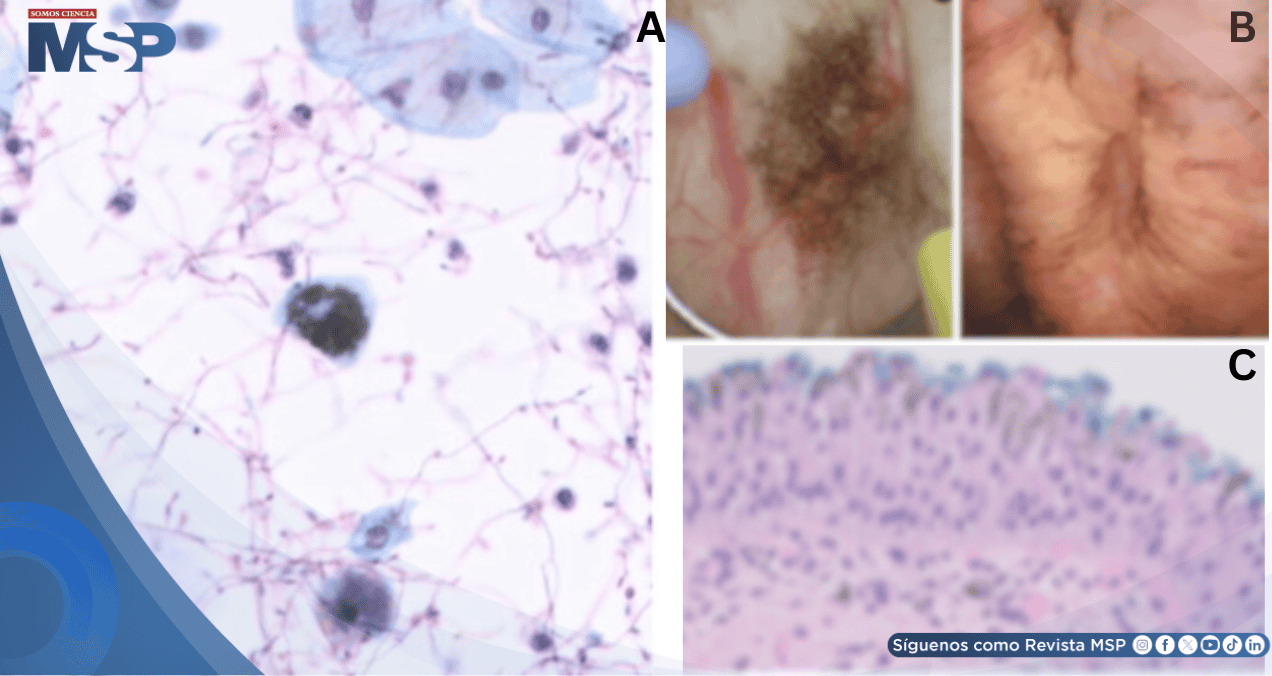 La exploración física fue normal. El análisis de orina descartó infección bacteriana, y el sedimento mostró hematíes sin dismorfismo. La citología urinaria reveló una infección grave por cándida y células uroteliales con pigmento de melanina, hallazgo inusual que orientó el diagnóstico.