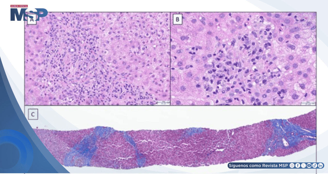 La biopsia hepática percutánea demostró un infiltrado linfoplasmocitario portal y lobular intenso con hepatitis de interfaz focal, necrosis confluente lobular y proliferación ductal leve, acompañado de depósitos de histiocitos epitelioides.