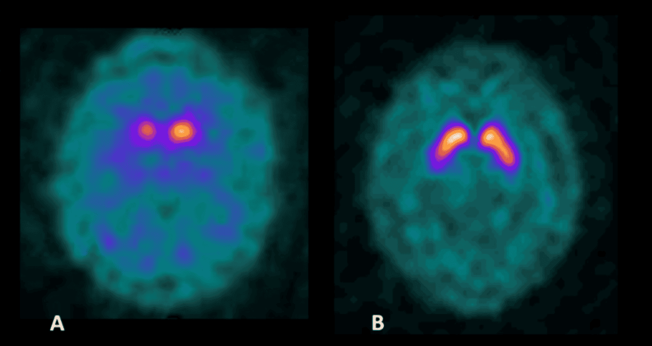 El DaTSCAN mostró una captación reducida bilateral del transportador de dopamina, con predominio en el lado derecho, hallazgo característico de neurodegeneración dopaminérgica y diagnóstico confirmatorio de enfermedad de Parkinson idiopática.