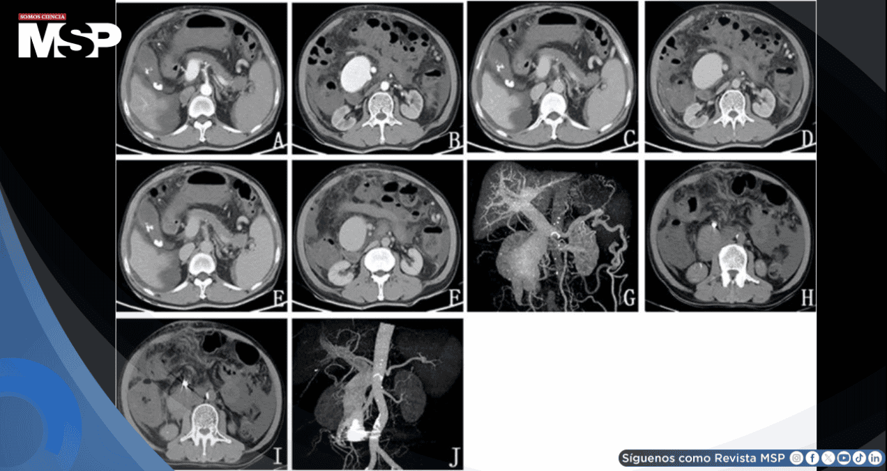 Sumado a eso, se identificó hipertensión portal con formación de extensa circulación colateral que comprometía el esófago, el fondo gástrico y la pared abdominal. Un hallazgo particularmente llamativo fue la dilatación de aspecto tumoral de la vena mesentérica superior, acompañada de formación de ascitis.