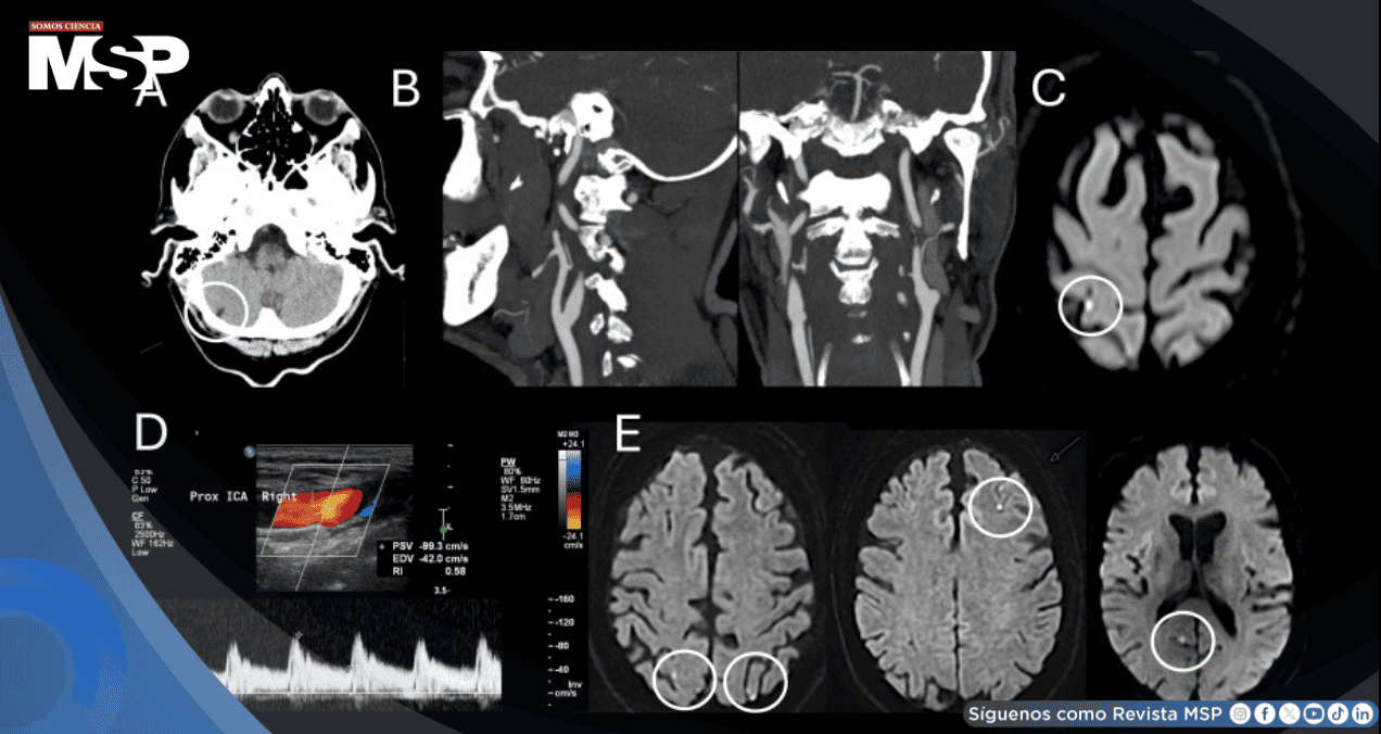 Los estudios complementarios incluyeron ecografía dúplex de vasos del cuello que mostró aterosclerosis íntima discreta, telemetría de 36 horas sin evidencia de fibrilación auricular, y ecocardiografía transesofágica sin fuente embólica identificable ni patología valvular.