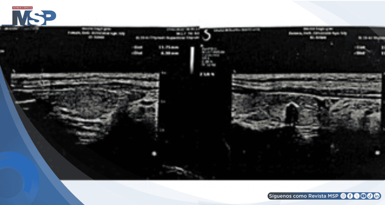 Los hallazgos ecográficos mostraron ambos lóbulos tiroideos con tamaño reducido y disminución heterogénea de la ecogenicidad del parénquima, hallazgos compatibles con tiroiditis linfocítica crónica.