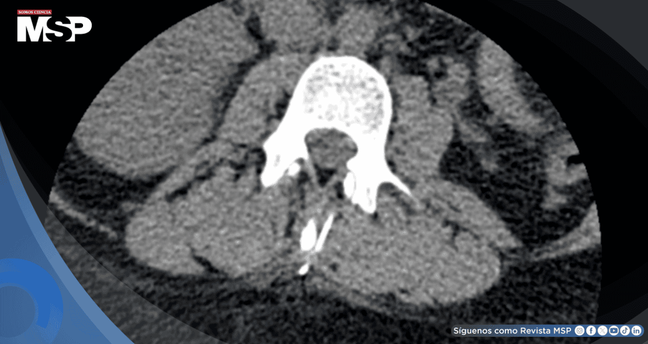 La tomografía computarizada confirmó la presencia del fragmento metálico lineal ubicado en la musculatura paravertebral a nivel L3, aproximadamente 1 cm lateral al proceso espinoso. No se identificó compromiso del canal espinal, hematoma epidural ni otras complicaciones asociadas. La localización superficial del fragmento fue determinante para la planificación terapéutica.