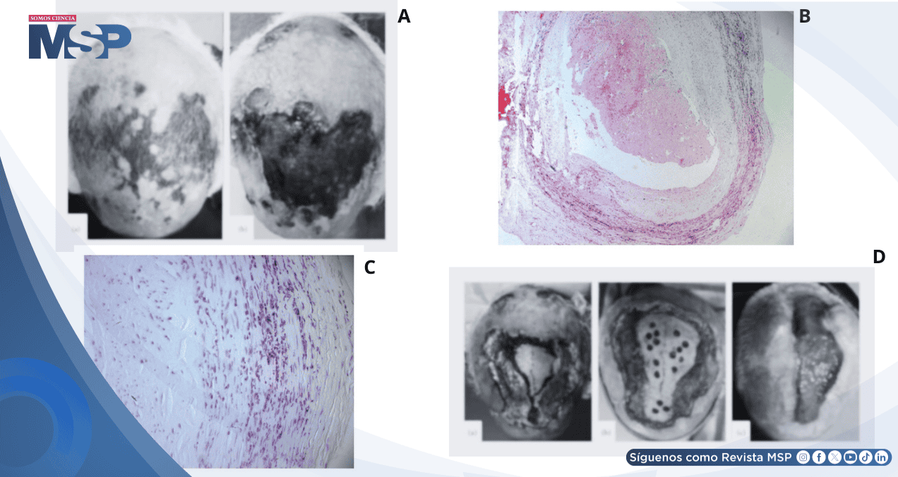 Un adulto de 72 años, con antecedentes de hipertensión arterial, dislipidemia y amputación de miembro inferior derecho por isquemia aguda hace ocho años, consultó por un cuadro de una semana de evolución caracterizado por ulceraciones necróticas dolorosas del cuero cabelludo. La lesión se inició como un parche hemorrágico en la región parietal que progresó rápidamente en tan solo dos días hacia regiones frontal y occipital.