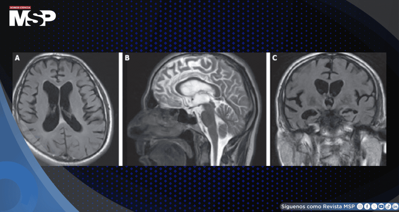 Las imágenes de resonancia magnética craneal revelaron atrofia cerebral y cerebelosa global, así como secuelas de traumatismo en la sustancia blanca subcortical del lóbulo parietal derecho, sin evidencia de realce con contraste. Ante estos hallazgos, se decidió realizar una punción lumbar para analizar el líquido cefalorraquídeo.
