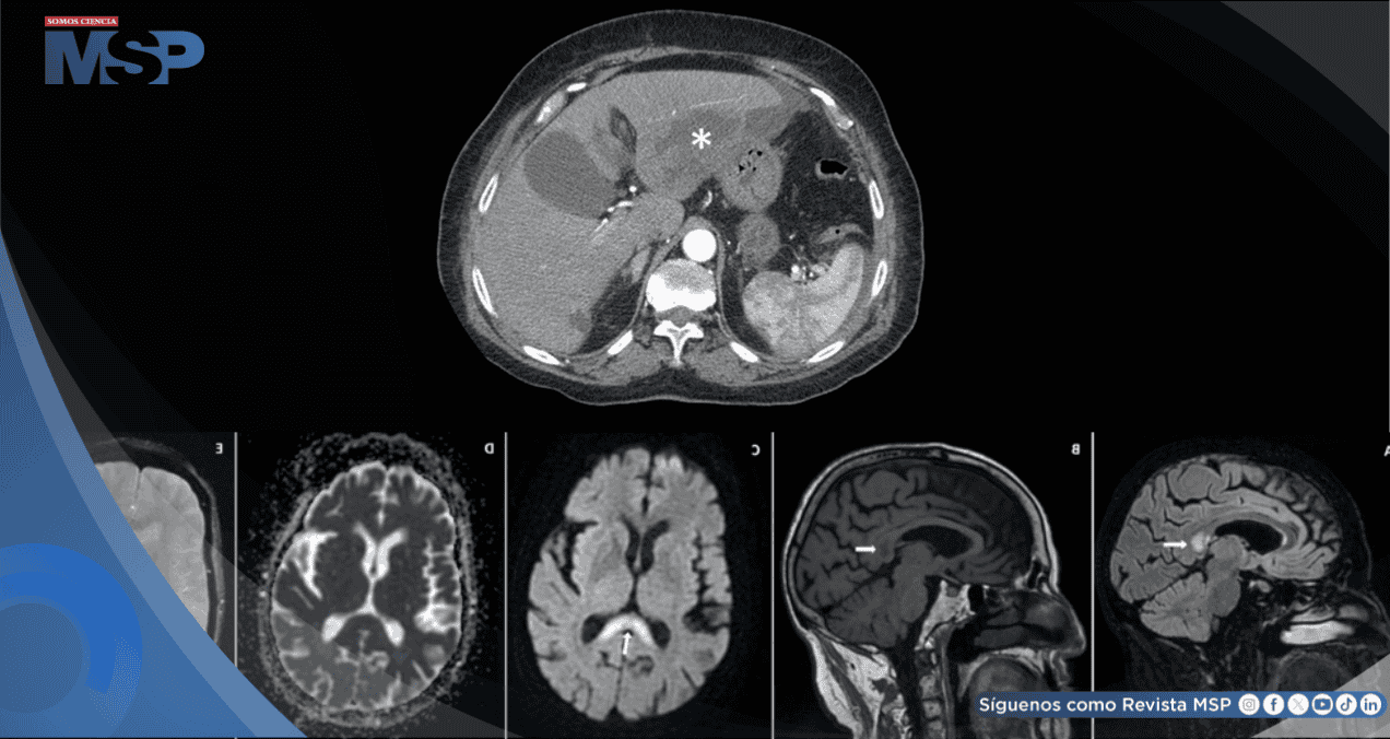 En las secuencias de difusión (DWI), la lesión también era hiperintensa, pero no mostraba restricción de la difusión en el mapa ADC, un patrón que puede verse en las encefalopatías tóxico-metabólicas. No se observaron signos de hemorragia. Estos hallazgos son característicos, aunque no exclusivos, de la neurotoxicidad por metronidazol.