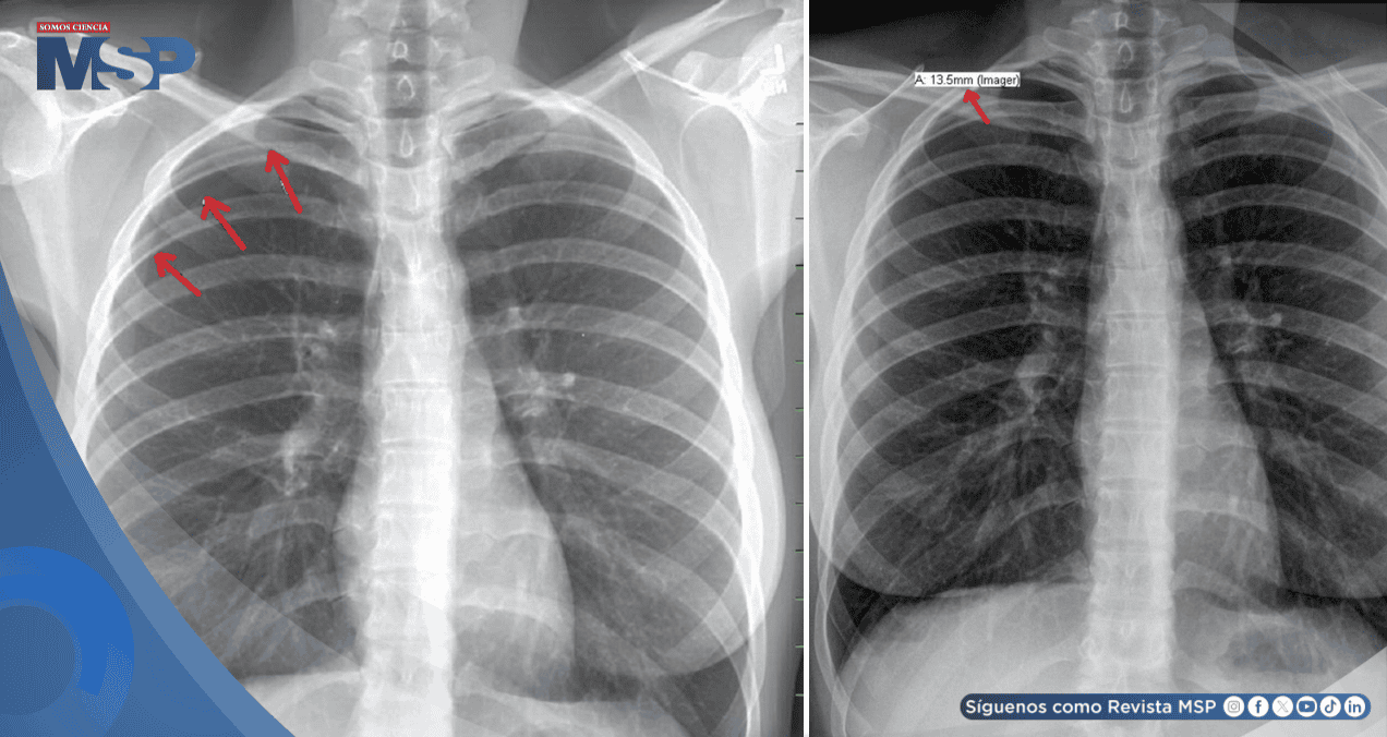Sin embargo, tras realizar un estiramiento indicado por el terapeuta para aliviar una sensación de rigidez, la paciente experimentó un dolor agudo bajo la escápula que empeoraba con la inspiración. En ese momento, el síntoma fue interpretado como una distensión muscular y se manejó con maniobras de liberación, tras lo cual la paciente reportó una mejoría y fue dada de alta sin signos de alarma respiratoria.