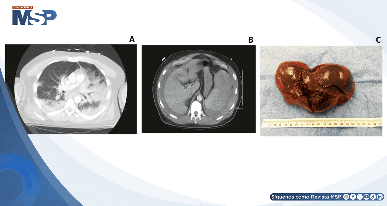 La tomografía computarizada reveló consolidación pulmonar extensa sin embolia pulmonar, y hallazgos abdominales alarmantes: líquido perihepático y perisplénico con margen esplénico indistinto y áreas de baja densidad sugestivas de lesión o ruptura esplénica. Llamativamente, el paciente negó cualquier antecedente traumático.