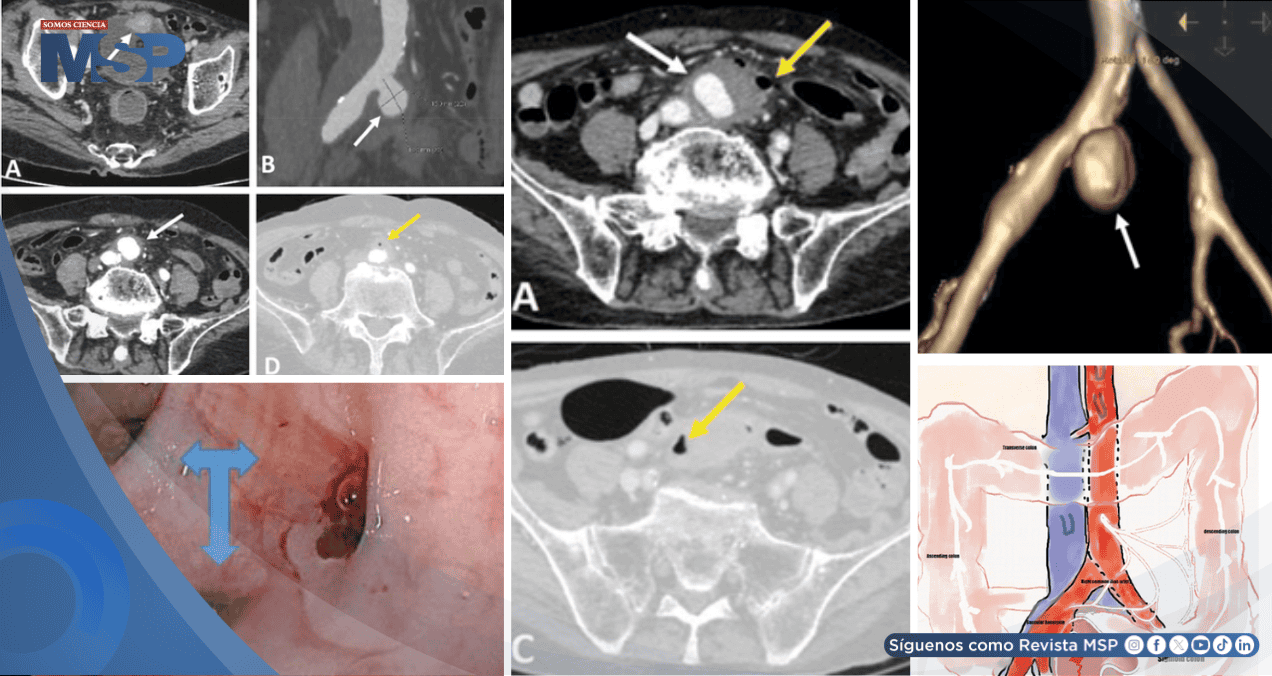 Sus hallazgos son determinantes: muestra el crecimiento del aneurisma, signos de infección activa como el edema y el gas en la grasa perivascular, y, de manera crítica, la relación anatómica entre el aneurisma y las estructuras digestivas adyacentes, sugiriendo la fístula. La presencia de gas extraintestinal o la extravasación de medio de contraste hacia la luz del colon son hallazgos altamente específicos.