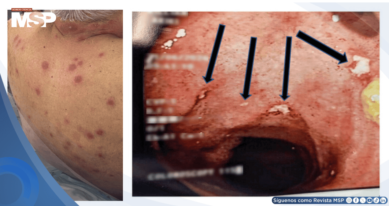 La presentación incluyó fiebre alta, erupción cutánea dolorosa y síntomas gastrointestinales, su diagnóstico se estableció mediante biopsia cutánea e ileocolonoscopia.