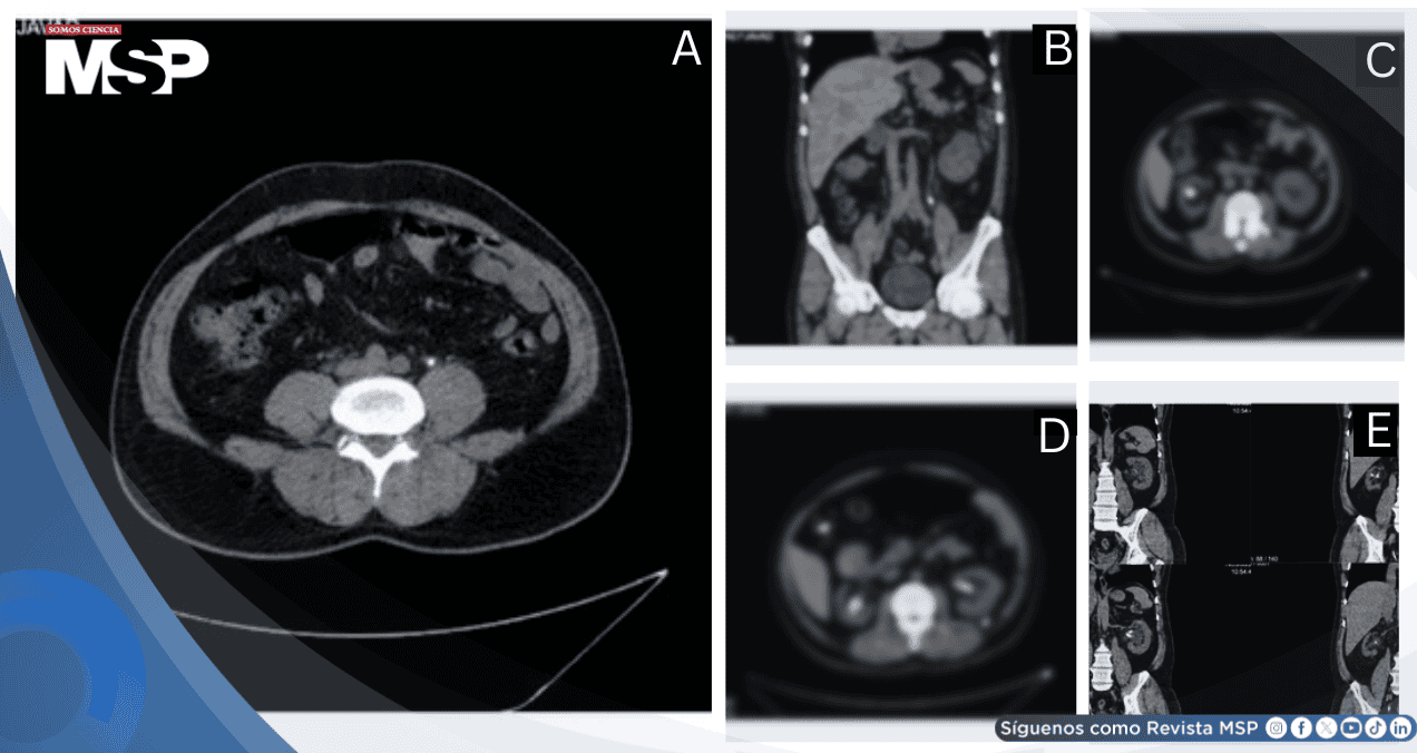 Se realizó tomografía computarizada sin contraste como modalidad de imagen primaria, seleccionada por su precisión superior en la detección de carga litiásica, hidronefrosis y complicaciones potenciales. Los hallazgos revelaron:
