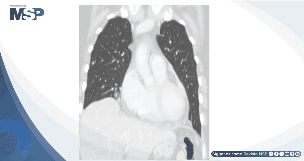 Al examen físico de ingreso, la paciente se encontraba consciente, orientada y colaboradora, con eupnea en reposo y estabilidad hemodinámica. A la auscultación cardíaca presentaba tonos rítmicos sin soplos, mientras que la auscultación pulmonar reveló disminución del murmullo vesicular en la base derecha. El abdomen era blando, depresible y no doloroso, sin evidencia de edema en extremidades inferiores.