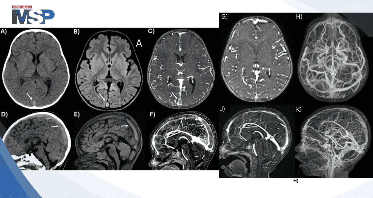 La tomografía computarizada craneal sin contraste mostró un seno sagital superior heterogéneo, hallazgo que fue confirmado mediante resonancia magnética cerebral y venografía por resonancia magnética, las cuales demostraron trombosis del seno transverso derecho, seno sagital superior y venas corticales adyacentes.