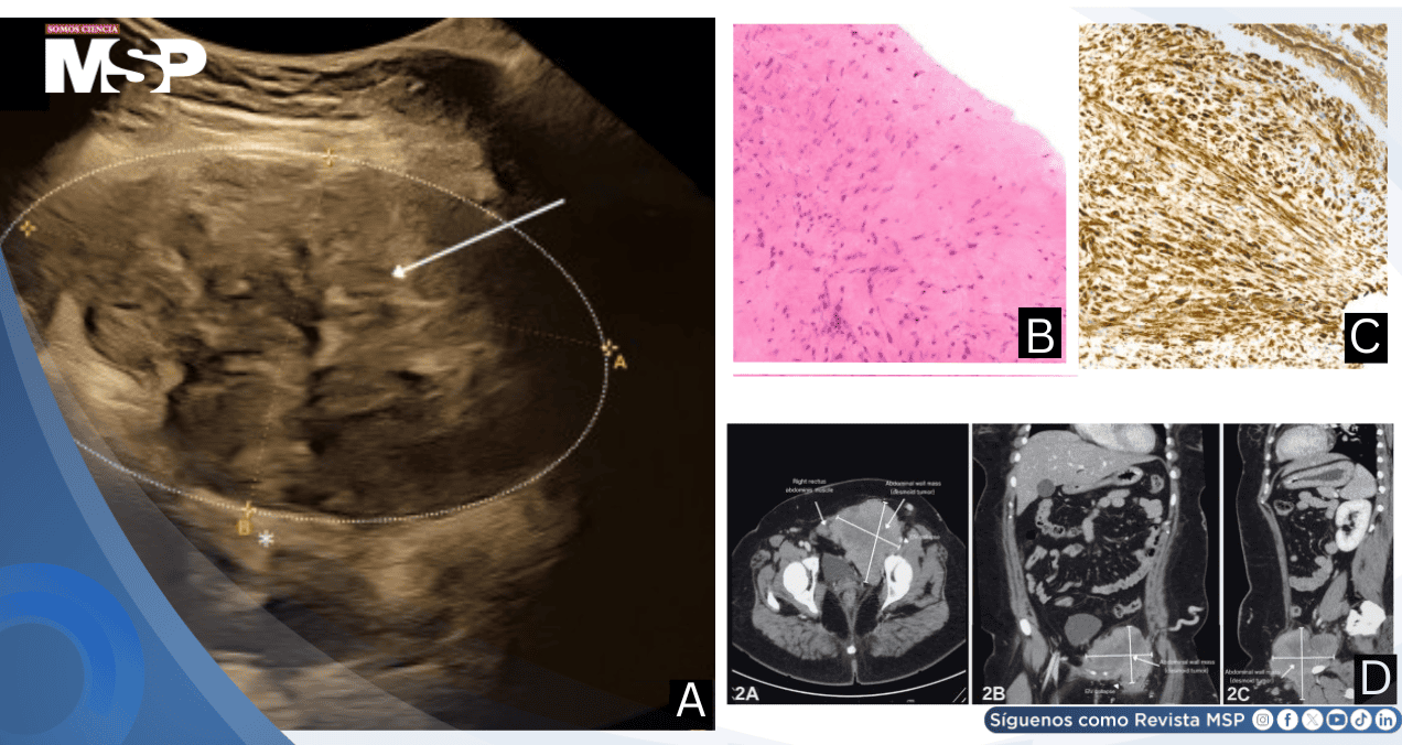 Las imágenes demostraron una masa heterogénea en la pared abdominal inferior izquierda con compromiso bilateral de los músculos rectos abdominales, extensión al músculo psoas izquierdo, obturador interno y pectíneo, con infiltración hacia el canal inguinal.