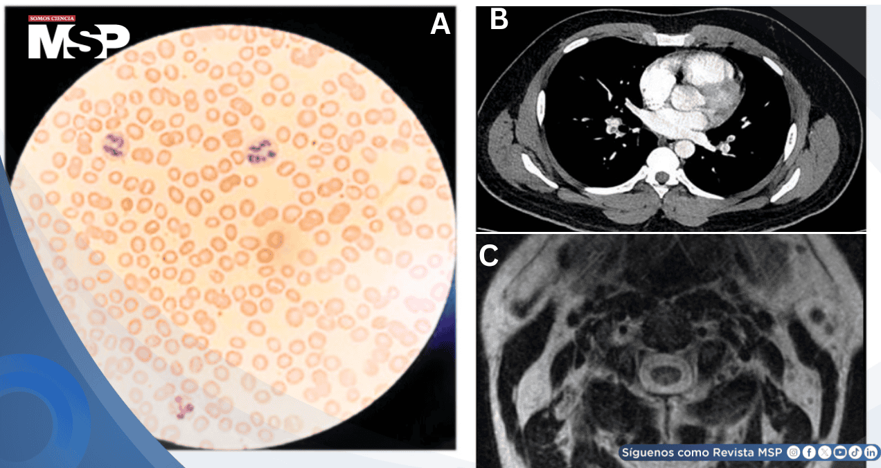 Los estudios de laboratorio evidenciaron anemia megaloblástica con hemoglobina de 10.6 g/dL y volumen corpuscular medio elevado de 100 fL. El frotis periférico demostró neutrófilos hipersegmentados, hallazgo característico de la deficiencia de vitamina B12.
