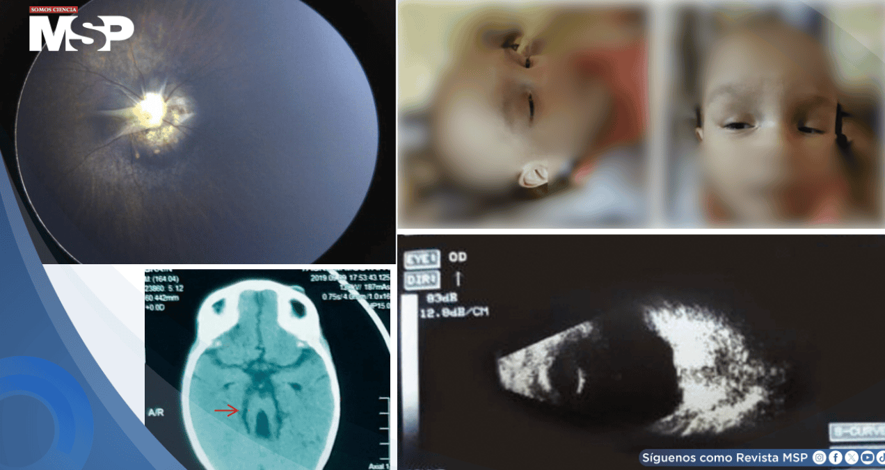Se trata de una lactante de un año de edad, derivada a consulta por presentar ptosis bilateral y mala fijación visual. El neurólogo remitente reportó retraso en el crecimiento y desarrollo, y planteó la posibilidad de síndrome de Dandy-Walker debido a una anomalía cerebelosa observada en una tomografía computarizada previa que no estaba adjunta.