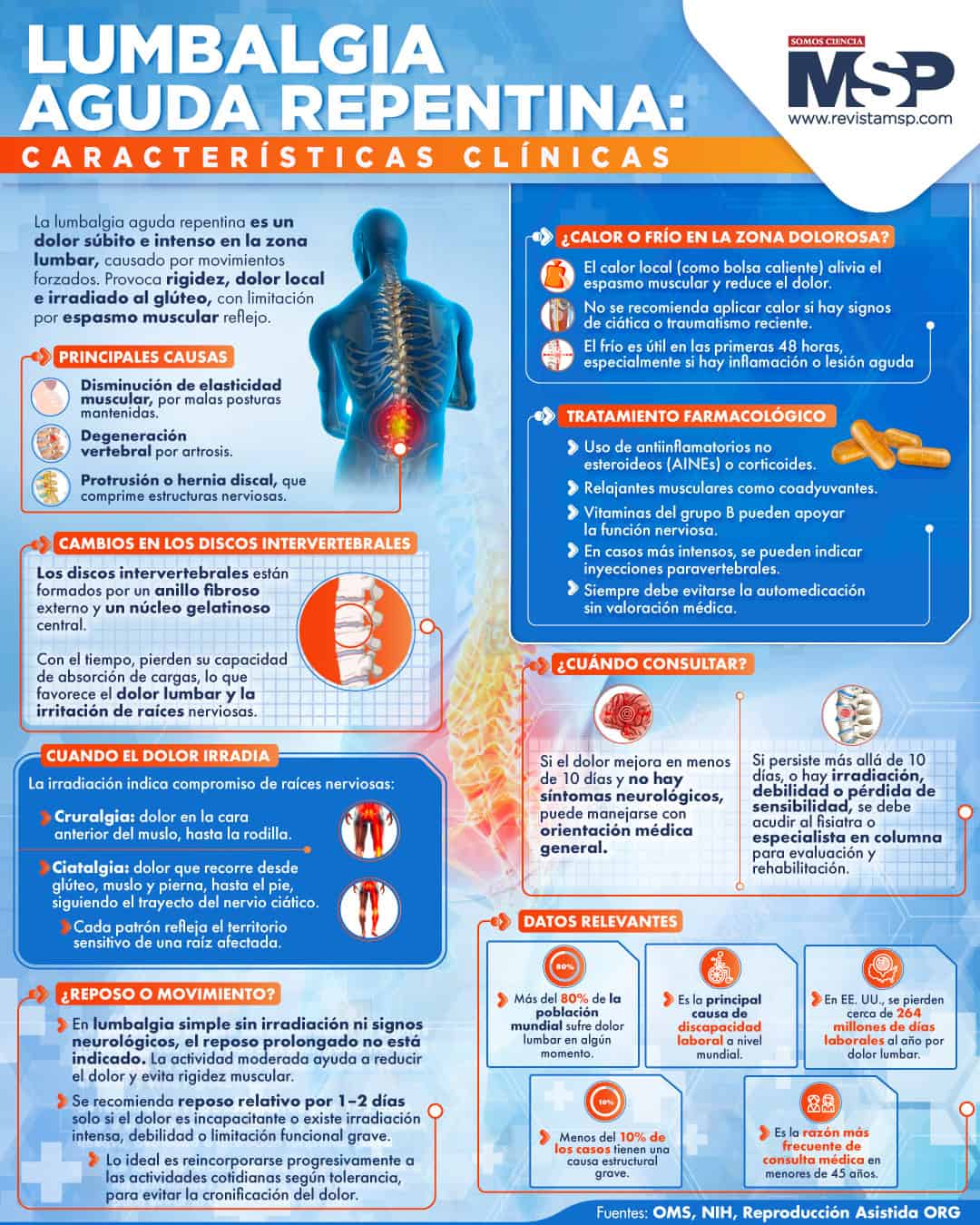 #InfografíaMSP La lumbalgia aguda repentina es un dolor intenso y súbito en la parte baja de la espalda, provocado muchas veces por malas posturas o esfuerzos bruscos. Puede generar espasmo muscular, rigidez e incluso irradiación del dolor hacia glúteos o piernas.