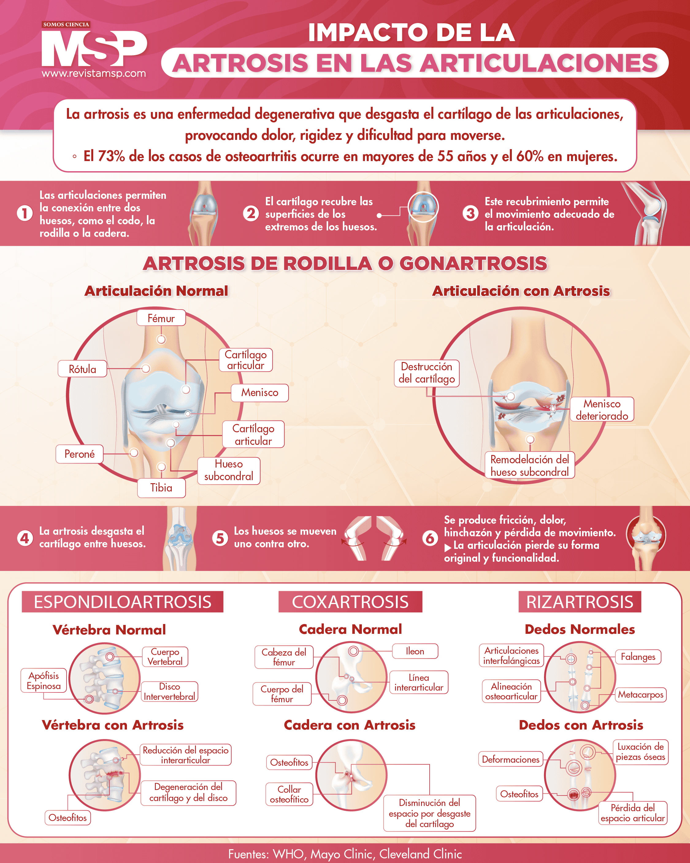#InfografíaMSP La artrosis desgasta el cartílago que recubre las articulaciones, afectando su movilidad y provocando dolor, rigidez e inflamación. A medida que avanza, puede alterar por completo la estructura de zonas como rodillas, caderas, columna y manos.